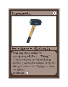 Παράδειγμα αντικειμένου για φιγούρα. Με κόστος μία κάρτα βασικής αρχής οποιουδήποτε χρώματος βάζεις την “Βαριοπούλα” στο παιχνίδι. Με κόστος άλλη μία κάρτα βασικής αρχής εξοπλίζεις μια φιγούρα η οποία αποκτά +1/0 και “Χάος”. Ένα αντικείμενο με κόστος εξοπλισμού μπορεί να επανεξοπλίζει όποιαδήποτε φιγούρα, οποιαδήποτε στιγμή αν μπορείς να πληρώσεις το κόστος.