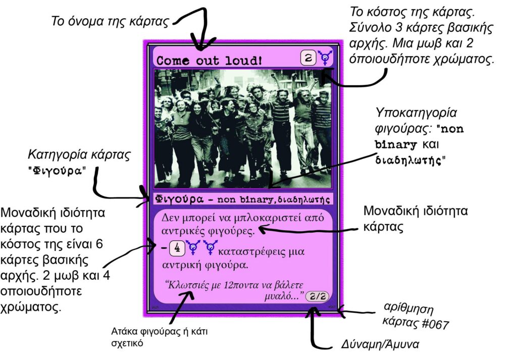 Η μωβ φιγούρα “Come out loud” κατέχει μια ιδίοτητα που λέει “Δεν μπορεί να μπλοκαριστεί από αντρικές φιγούρες”. Όποτε ο αντίπαλος άμα εκείνη την στιγμή κατείχε μόνο αντρίκες φιγούρες θα αδυνατούσε να την μπλοκάρει.