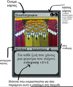 Παράδειγμα αντικείμενου -εξοπλισμός. Όλες οι φιγούρες παίρνουν ενίσχυση +1/+1 όσο “τα σόπια περιφρούρησης” παραμένουν στο παιχνίδι.