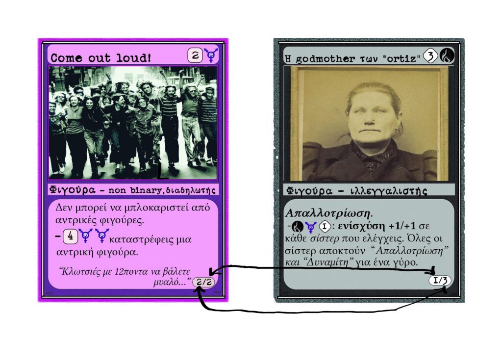 Η δύναμη της godmother των Ortiz θα χτυπηθεί με την άμυνα του “Come out loud”. 2 άμυνα της μωβ μείον 1 δύναμη(επίθεση) της μαύρης = 1 οπότε η μωβ φιγούρα θα επιβιώσει. Ταυτόχρονα η δύναμη της μωβ θα πέσει πάνω στην άμυνα της μαύρης φιγούρας που επιτίθεται οπότε 3 άμυνα της μαύρης μείον 2 δύναμη της μωβ = 1. Οπότε και η μαύρη φιγούρα θα επιβιώσει. Καμιά ζημιά δεν θα έχει ασκηθεί στην παίχτρια που αμύνθηκε, καθώς έβαλε για άμυνα μια φιγούρα. Γλίτωσε ζωές και δεν καταστράφηκε η φιγούρα της. Το πως επιτίθεσαι και αμύνεσαι, πότε και με πόσες φιγούρες είναι θέμα στρατηγικής.
